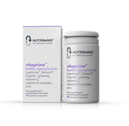 Το vitaprime™ της Nutramins™  είναι ένα ολιστικό συμπλήρωμα διατροφής σχεδιασμένο για την ευεξία και αντιγήρανση του οργανισμού. Περιέχει Lepticore®, Sensoril® Ashwagandha, Capros®, ginseng, σύμπλεγμα βιταμινών Β, ψευδάργυρο και βιταμίνη C  τα οποία συμβάλλουν στη φυσιολογική ψυχολογική λειτουργία, στην προστασία από το οξειδωτικό στρες, στη μείωση της κούρασης και κόπωσης, το φυσιολογικό μεταβολισμό, τη φυσιολογική λειτουργία του ανοσοποιητικού συστήματος και στην υγεία των μαλλιών, του δέρματος και των νυχιών.
